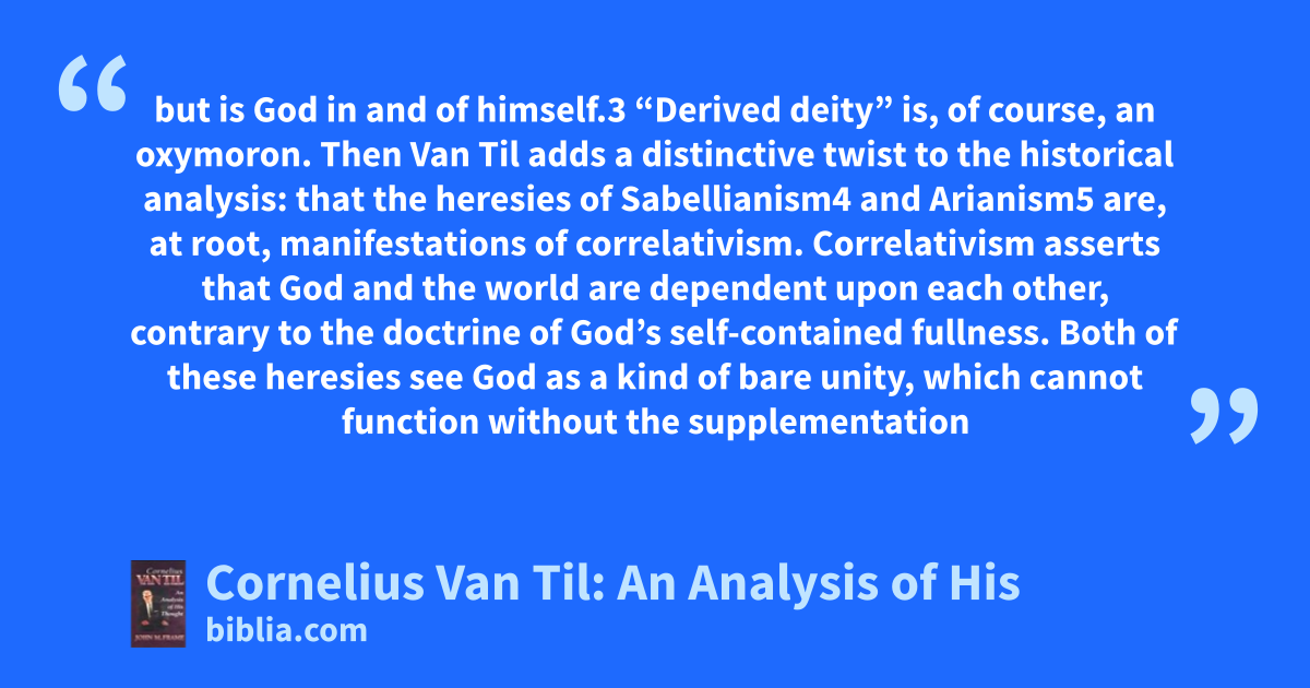 but is God in and of himself.3 “Derived deity” is, of course, an oxymoron. Then Van Til adds a distinctive twist to the historical analysis: that the heresies of Sabellianism4 and Arianism5 are, at root, manifestations of correlativism. Correlativism asserts that God and the world are dependent upon each other, contrary to the doctrine of God’s self-contained fullness. Both of these heresies see God as a kind of bare unity, which cannot function without the supplementation