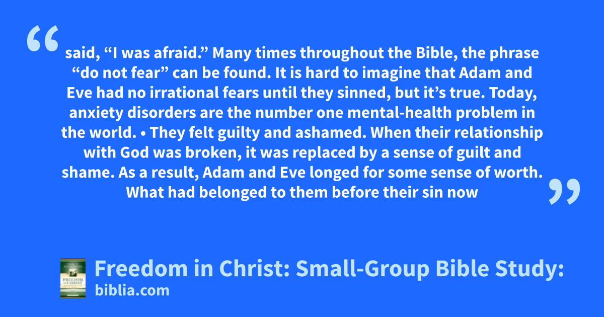said, “I was afraid.” Many times throughout the Bible, the phrase “do not fear” can be found. It is hard to imagine that Adam and Eve had no irrational fears until they sinned, but it’s true. Today, anxiety disorders are the number one mental-health problem in the world. • They felt guilty and ashamed. When their relationship with God was broken, it was replaced by a sense of guilt and shame. As a result, Adam and Eve longed for some sense of worth. What had belonged to them before their sin now