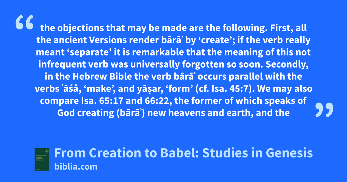 the objections that may be made are the following. First, all the ancient Versions render bārāʾ by ‘create’; if the verb really meant ‘separate’ it is remarkable that the meaning of this not infrequent verb was universally forgotten so soon. Secondly, in the Hebrew Bible the verb bārāʾ occurs parallel with the verbs ʿāśâ, ‘make’, and yāṣar, ‘form’ (cf. Isa. 45:7). We may also compare Isa. 65:17 and 66:22, the former of which speaks of God creating (bārāʾ) new heavens and earth, and the