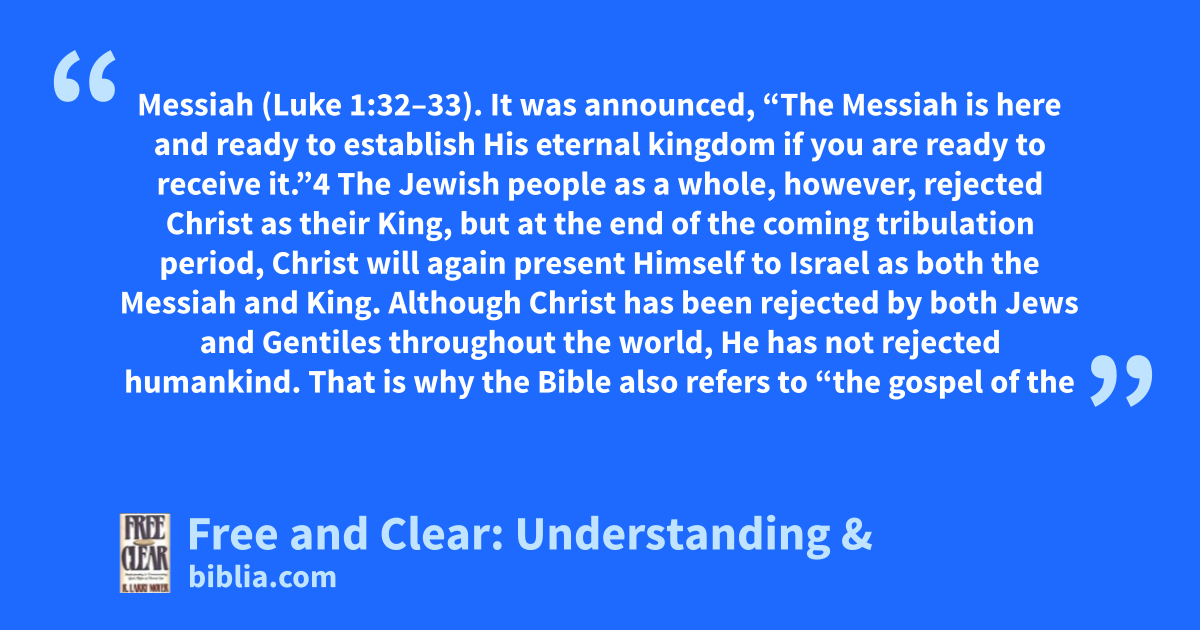 Messiah (Luke 1:32–33). It was announced, “The Messiah is here and ready to establish His eternal kingdom if you are ready to receive it.”4 The Jewish people as a whole, however, rejected Christ as their King, but at the end of the coming tribulation period, Christ will again present Himself to Israel as both the Messiah and King. Although Christ has been rejected by both Jews and Gentiles throughout the world, He has not rejected humankind. That is why the Bible also refers to “the gospel of the