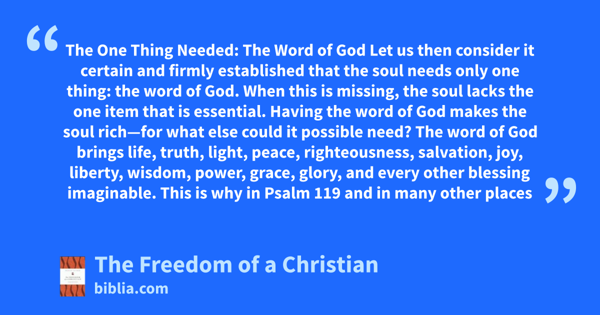 The One Thing Needed: The Word of God Let us then consider it certain and firmly established that the soul needs only one thing: the word of God. When this is missing, the soul lacks the one item that is essential. Having the word of God makes the soul rich—for what else could it possible need? The word of God brings life, truth, light, peace, righteousness, salvation, joy, liberty, wisdom, power, grace, glory, and every other blessing imaginable. This is why in Psalm 119 and in many other places