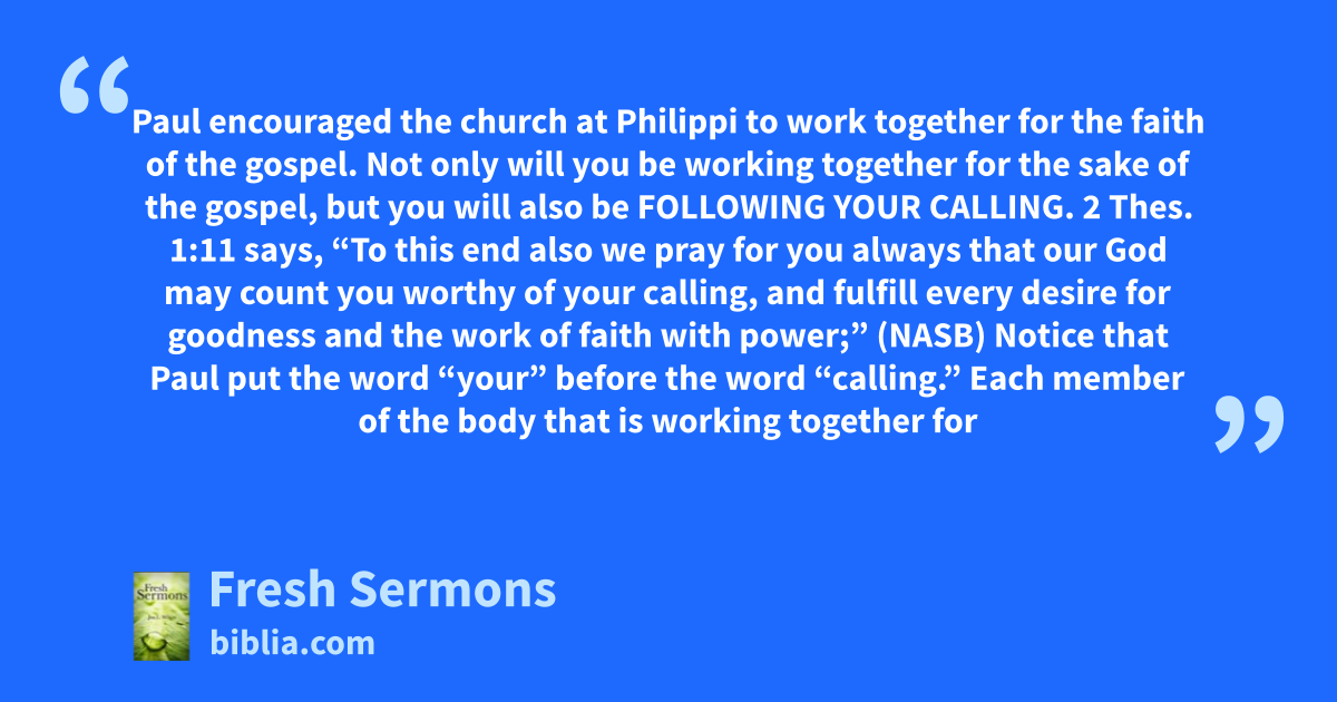Paul encouraged the church at Philippi to work together for the faith of the gospel. Not only will you be working together for the sake of the gospel, but you will also be FOLLOWING YOUR CALLING. 2 Thes. 1:11 says, “To this end also we pray for you always that our God may count you worthy of your calling, and fulfill every desire for goodness and the work of faith with power;” (NASB) Notice that Paul put the word “your” before the word “calling.” Each member of the body that is working together for