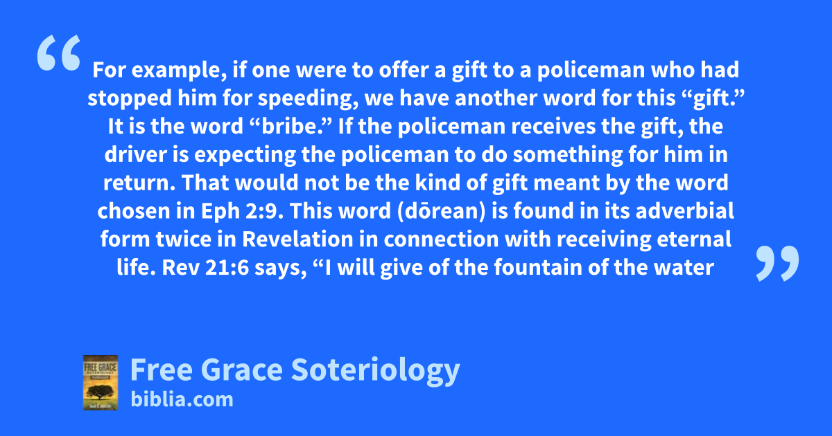 For example, if one were to offer a gift to a policeman who had stopped him for speeding, we have another word for this “gift.” It is the word “bribe.” If the policeman receives the gift, the driver is expecting the policeman to do something for him in return. That would not be the kind of gift meant by the word chosen in Eph 2:9. This word (dōrean) is found in its adverbial form twice in Revelation in connection with receiving eternal life. Rev 21:6 says, “I will give of the fountain of the water