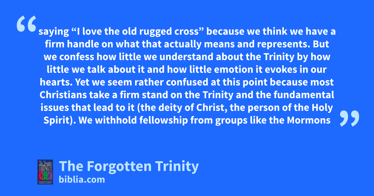 saying “I love the old rugged cross” because we think we have a firm handle on what that actually means and represents. But we confess how little we understand about the Trinity by how little we talk about it and how little emotion it evokes in our hearts. Yet we seem rather confused at this point because most Christians take a firm stand on the Trinity and the fundamental issues that lead to it (the deity of Christ, the person of the Holy Spirit). We withhold fellowship from groups like the Mormons