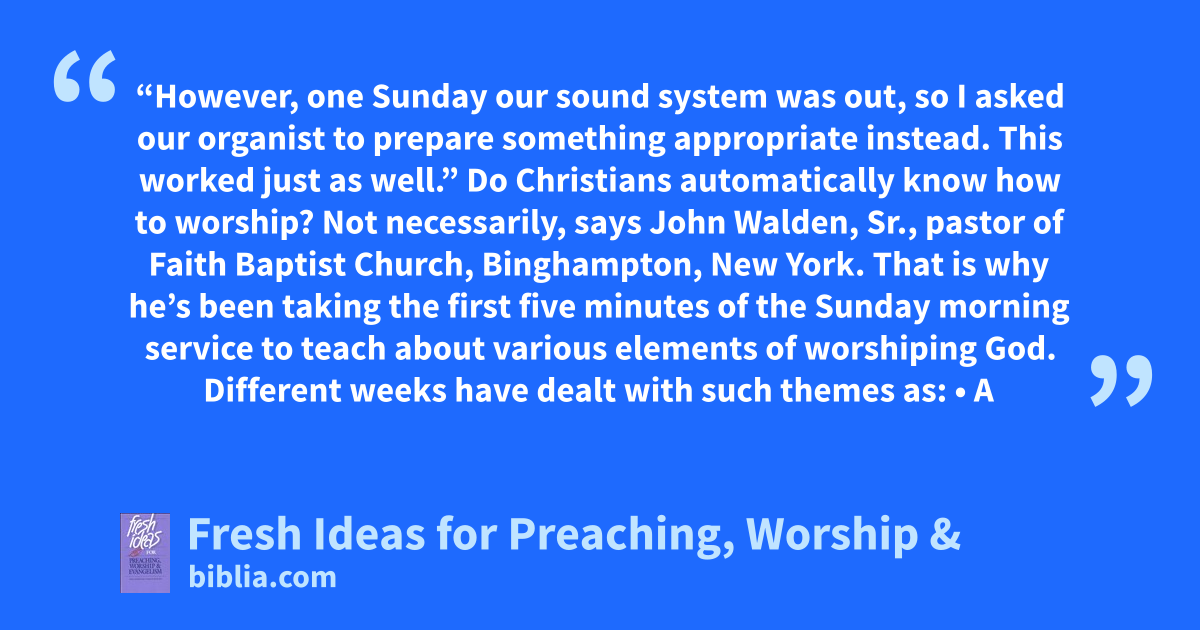 “However, one Sunday our sound system was out, so I asked our organist to prepare something appropriate instead. This worked just as well.” Do Christians automatically know how to worship? Not necessarily, says John Walden, Sr., pastor of Faith Baptist Church, Binghampton, New York. That is why he’s been taking the first five minutes of the Sunday morning service to teach about various elements of worshiping God. Different weeks have dealt with such themes as: • A