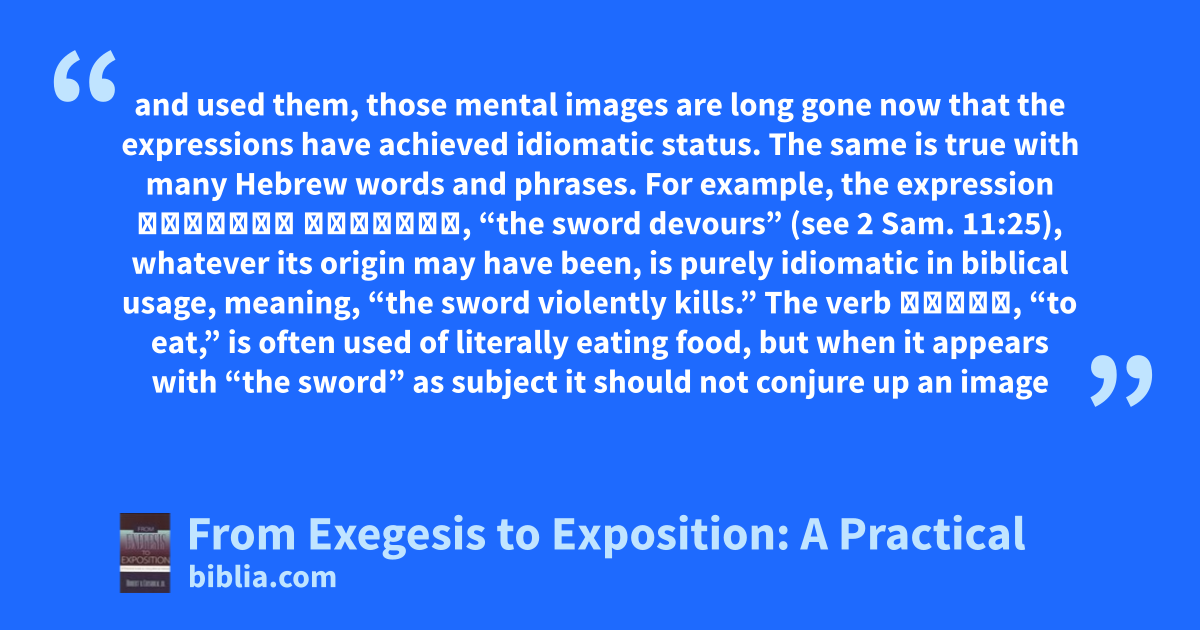and used them, those mental images are long gone now that the expressions have achieved idiomatic status. The same is true with many Hebrew words and phrases. For example, the expression תֹּאכֵל הַחֶרֶב, “the sword devours” (see 2 Sam. 11:25), whatever its origin may have been, is purely idiomatic in biblical usage, meaning, “the sword violently kills.” The verb אַכַל, “to eat,” is often used of literally eating food, but when it appears with “the sword” as subject it should not conjure up an image