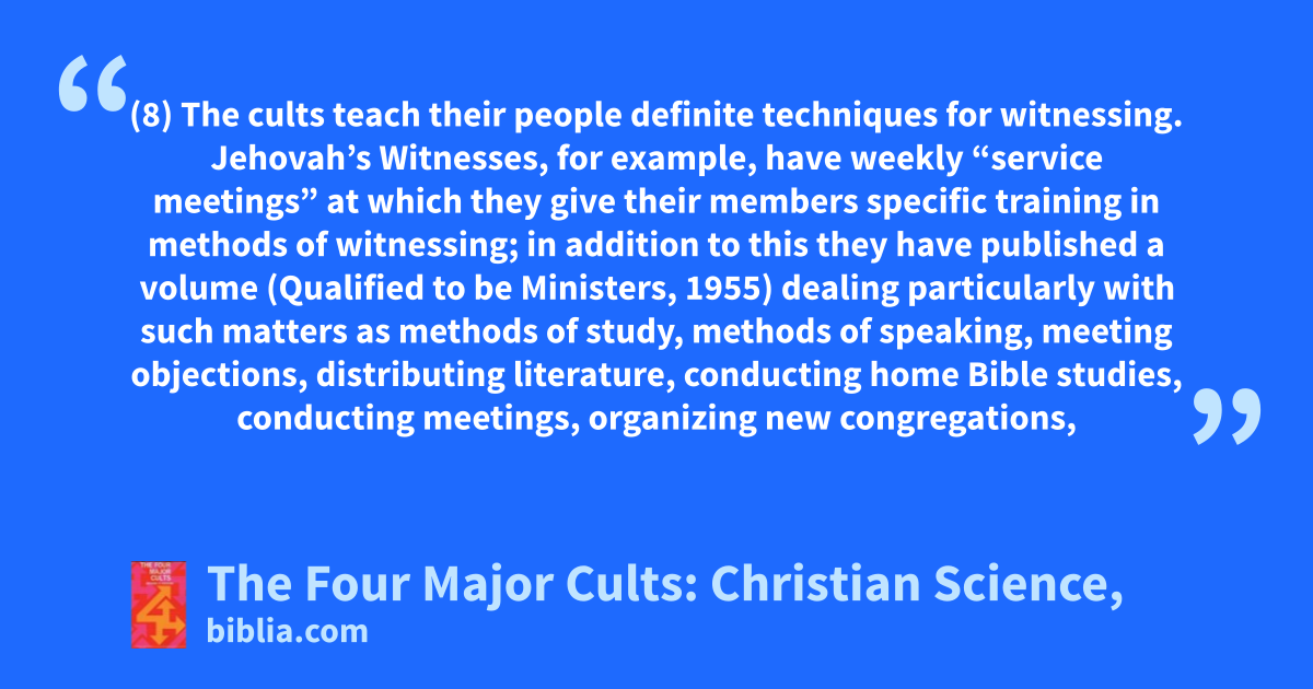 (8) The cults teach their people definite techniques for witnessing. Jehovah’s Witnesses, for example, have weekly “service meetings” at which they give their members specific training in methods of witnessing; in addition to this they have published a volume (Qualified to be Ministers, 1955) dealing particularly with such matters as methods of study, methods of speaking, meeting objections, distributing literature, conducting home Bible studies, conducting meetings, organizing new congregations,