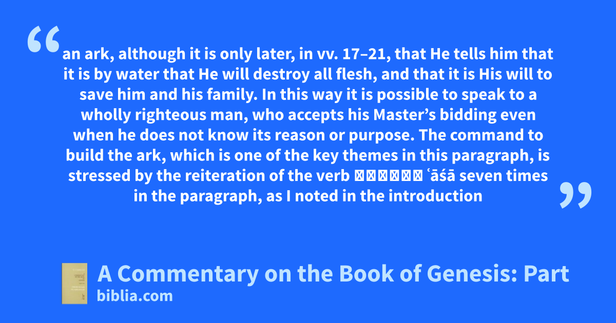 an ark, although it is only later, in vv. 17–21, that He tells him that it is by water that He will destroy all flesh, and that it is His will to save him and his family. In this way it is possible to speak to a wholly righteous man, who accepts his Master’s bidding even when he does not know its reason or purpose. The command to build the ark, which is one of the key themes in this paragraph, is stressed by the reiteration of the verb עָשָׂה ʿāśā seven times in the paragraph, as I noted in the introduction