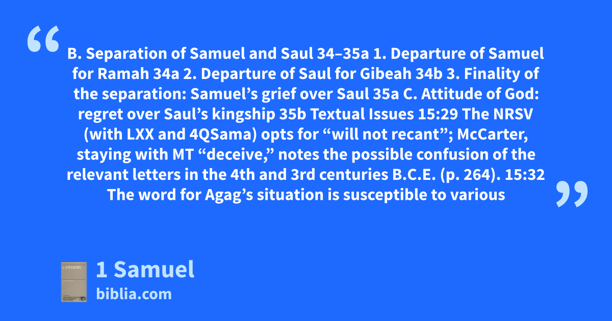 B. Separation of Samuel and Saul 34–35a 1. Departure of Samuel for Ramah 34a 2. Departure of Saul for Gibeah 34b 3. Finality of the separation: Samuel’s grief over Saul 35a C. Attitude of God: regret over Saul’s kingship 35b Textual Issues 15:29 The NRSV (with LXX and 4QSama) opts for “will not recant”; McCarter, staying with MT “deceive,” notes the possible confusion of the relevant letters in the 4th and 3rd centuries B.C.E. (p. 264). 15:32 The word for Agag’s situation is susceptible to various