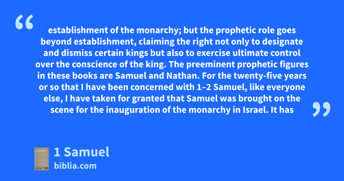 establishment of the monarchy; but the prophetic role goes beyond establishment, claiming the right not only to designate and dismiss certain kings but also to exercise ultimate control over the conscience of the king. The preeminent prophetic figures in these books are Samuel and Nathan. For the twenty-five years or so that I have been concerned with 1–2 Samuel, like everyone else, I have taken for granted that Samuel was brought on the scene for the inauguration of the monarchy in Israel. It has