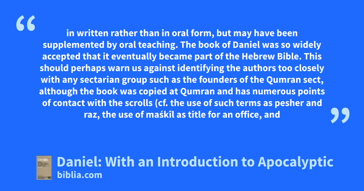 in written rather than in oral form, but may have been supplemented by oral teaching. The book of Daniel was so widely accepted that it eventually became part of the Hebrew Bible. This should perhaps warn us against identifying the authors too closely with any sectarian group such as the founders of the Qumran sect, although the book was copied at Qumran and has numerous points of contact with the scrolls (cf. the use of such terms as pesher and raz, the use of maśkîl as title for an office, and
