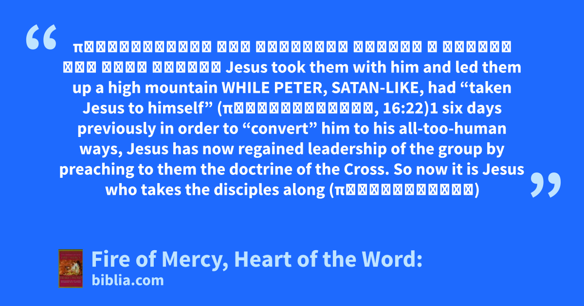 παραλαμβάνει καὶ ἀναφέρει αὐτοὺς ὁ Ἰησοῦς εἰς ὄρος ὑψηλόν Jesus took them with him and led them up a high mountain WHILE PETER, SATAN-LIKE, had “taken Jesus to himself” (προσλαβόμενος, 16:22)1 six days previously in order to “convert” him to his all-too-human ways, Jesus has now regained leadership of the group by preaching to them the doctrine of the Cross. So now it is Jesus who takes the disciples along (παραλαμβάνει)