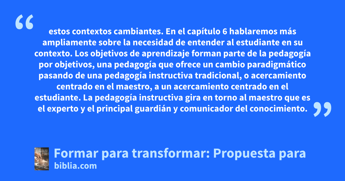 estos contextos cambiantes. En el capítulo 6 hablaremos más ampliamente sobre la necesidad de entender al estudiante en su contexto. Los objetivos de aprendizaje forman parte de la pedagogía por objetivos, una pedagogía que ofrece un cambio paradigmático pasando de una pedagogía instructiva tradicional, o acercamiento centrado en el maestro, a un acercamiento centrado en el estudiante. La pedagogía instructiva gira en torno al maestro que es el experto y el principal guardián y comunicador del conocimiento.