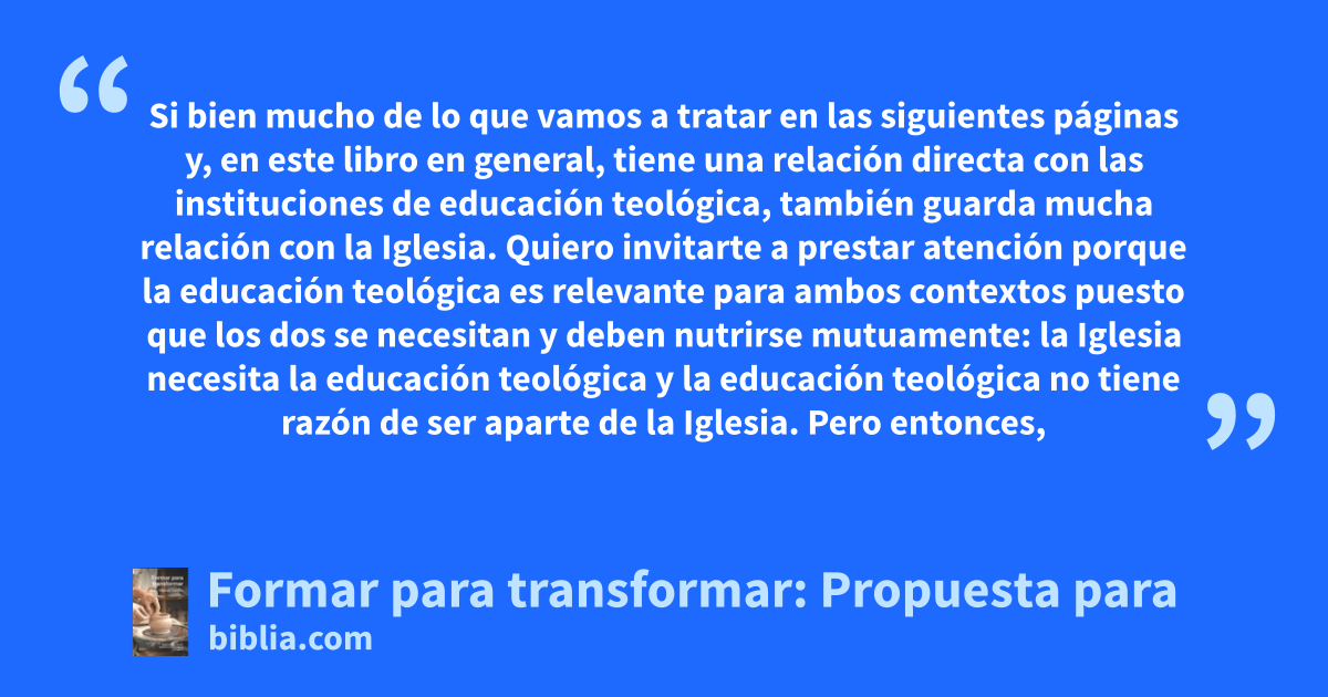 Si bien mucho de lo que vamos a tratar en las siguientes páginas y, en este libro en general, tiene una relación directa con las instituciones de educación teológica, también guarda mucha relación con la Iglesia. Quiero invitarte a prestar atención porque la educación teológica es relevante para ambos contextos puesto que los dos se necesitan y deben nutrirse mutuamente: la Iglesia necesita la educación teológica y la educación teológica no tiene razón de ser aparte de la Iglesia. Pero entonces,