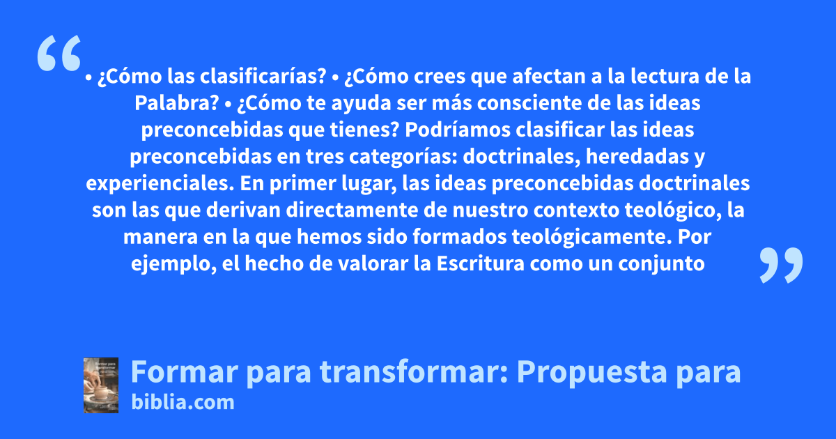 • ¿Cómo las clasificarías? • ¿Cómo crees que afectan a la lectura de la Palabra? • ¿Cómo te ayuda ser más consciente de las ideas preconcebidas que tienes? Podríamos clasificar las ideas preconcebidas en tres categorías: doctrinales, heredadas y experienciales. En primer lugar, las ideas preconcebidas doctrinales son las que derivan directamente de nuestro contexto teológico, la manera en la que hemos sido formados teológicamente. Por ejemplo, el hecho de valorar la Escritura como un conjunto