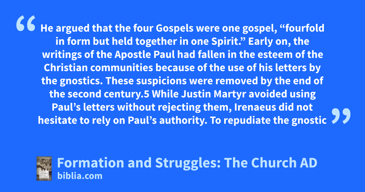 He argued that the four Gospels were one gospel, “fourfold in form but held together in one Spirit.” Early on, the writings of the Apostle Paul had fallen in the esteem of the Christian communities because of the use of his letters by the gnostics. These suspicions were removed by the end of the second century.5 While Justin Martyr avoided using Paul’s letters without rejecting them, Irenaeus did not hesitate to rely on Paul’s authority. To repudiate the gnostic