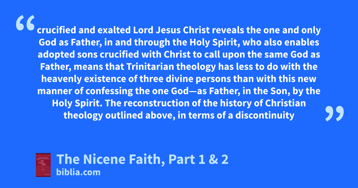 crucified and exalted Lord Jesus Christ reveals the one and only God as Father, in and through the Holy Spirit, who also enables adopted sons crucified with Christ to call upon the same God as Father, means that Trinitarian theology has less to do with the heavenly existence of three divine persons than with this new manner of confessing the one God—as Father, in the Son, by the Holy Spirit. The reconstruction of the history of Christian theology outlined above, in terms of a discontinuity
