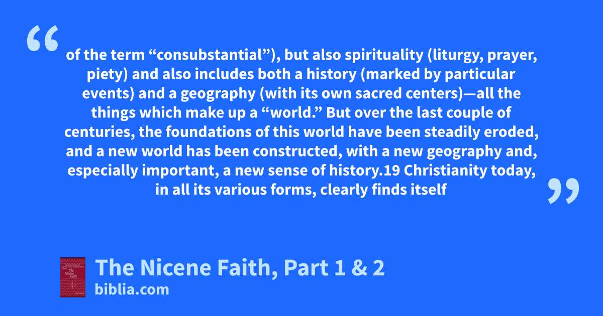 of the term “consubstantial”), but also spirituality (liturgy, prayer, piety) and also includes both a history (marked by particular events) and a geography (with its own sacred centers)—all the things which make up a “world.” But over the last couple of centuries, the foundations of this world have been steadily eroded, and a new world has been constructed, with a new geography and, especially important, a new sense of history.19 Christianity today, in all its various forms, clearly finds itself