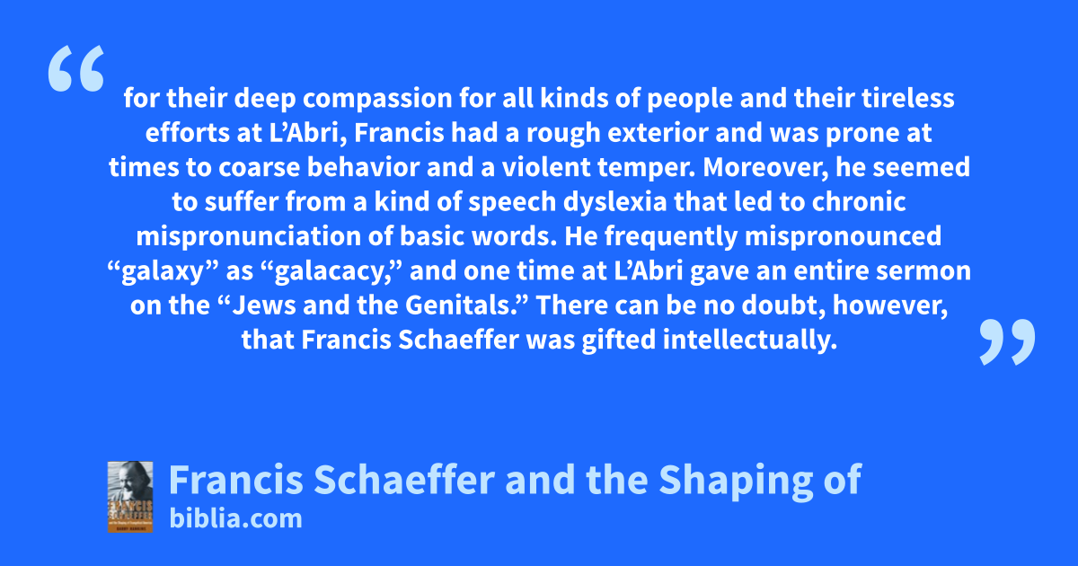 for their deep compassion for all kinds of people and their tireless efforts at L’Abri, Francis had a rough exterior and was prone at times to coarse behavior and a violent temper. Moreover, he seemed to suffer from a kind of speech dyslexia that led to chronic mispronunciation of basic words. He frequently mispronounced “galaxy” as “galacacy,” and one time at L’Abri gave an entire sermon on the “Jews and the Genitals.” There can be no doubt, however, that Francis Schaeffer was gifted intellectually.