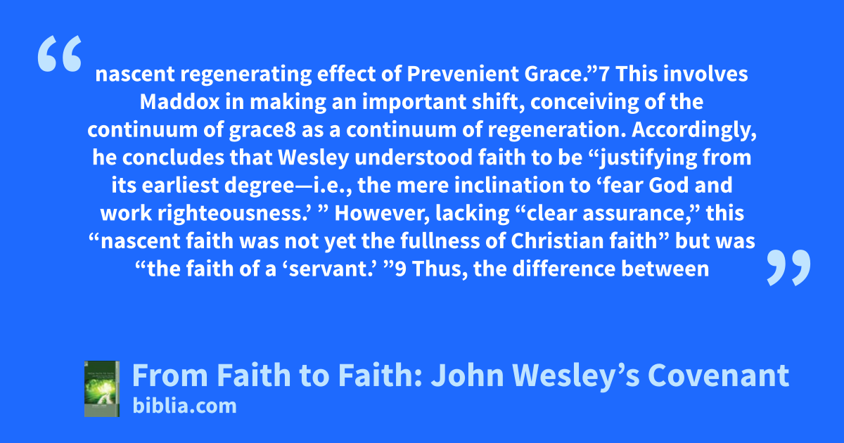 nascent regenerating effect of Prevenient Grace.”7 This involves Maddox in making an important shift, conceiving of the continuum of grace8 as a continuum of regeneration. Accordingly, he concludes that Wesley understood faith to be “justifying from its earliest degree—i.e., the mere inclination to ‘fear God and work righteousness.’ ” However, lacking “clear assurance,” this “nascent faith was not yet the fullness of Christian faith” but was “the faith of a ‘servant.’ ”9 Thus, the difference between