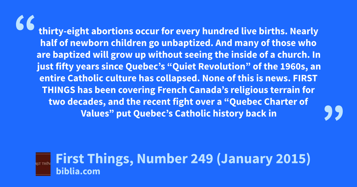 thirty-eight abortions occur for every hundred live births. Nearly half of newborn children go unbaptized. And many of those who are baptized will grow up without seeing the inside of a church. In just fifty years since Quebec’s “Quiet Revolution” of the 1960s, an entire Catholic culture has collapsed. None of this is news. FIRST THINGS has been covering French Canada’s religious terrain for two decades, and the recent fight over a “Quebec Charter of Values” put Quebec’s Catholic history back in