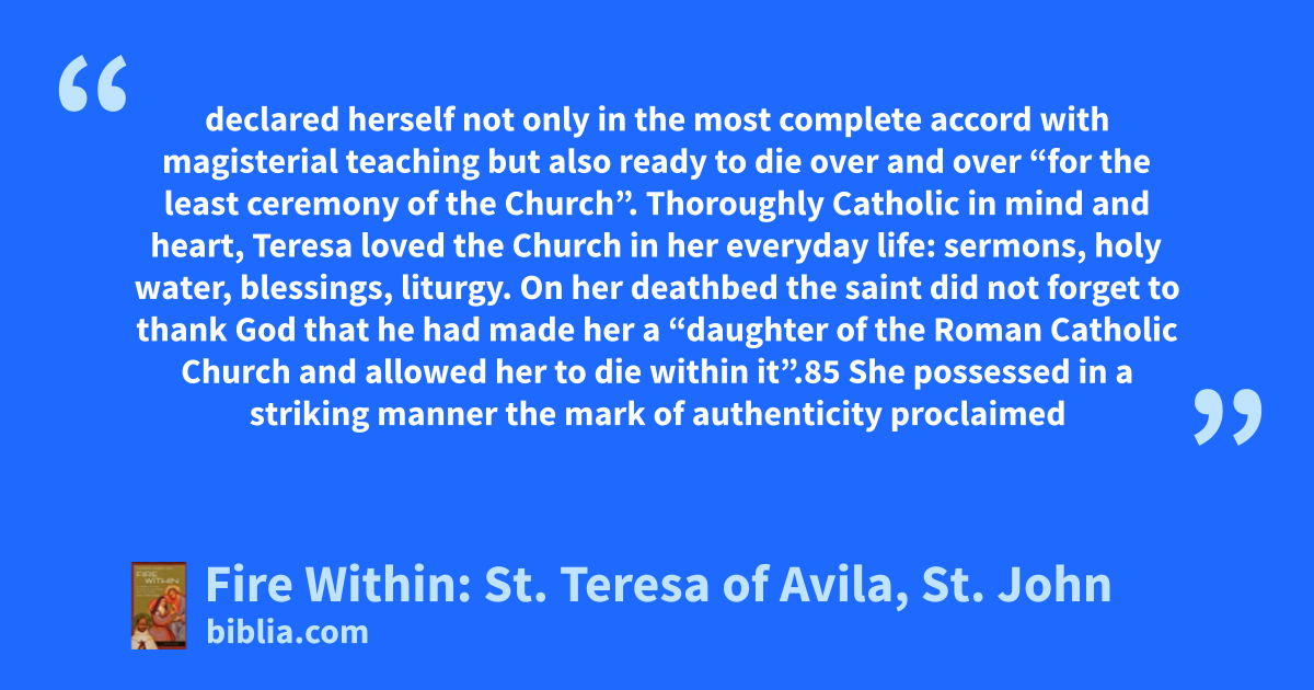 declared herself not only in the most complete accord with magisterial teaching but also ready to die over and over “for the least ceremony of the Church”. Thoroughly Catholic in mind and heart, Teresa loved the Church in her everyday life: sermons, holy water, blessings, liturgy. On her deathbed the saint did not forget to thank God that he had made her a “daughter of the Roman Catholic Church and allowed her to die within it”.85 She possessed in a striking manner the mark of authenticity proclaimed