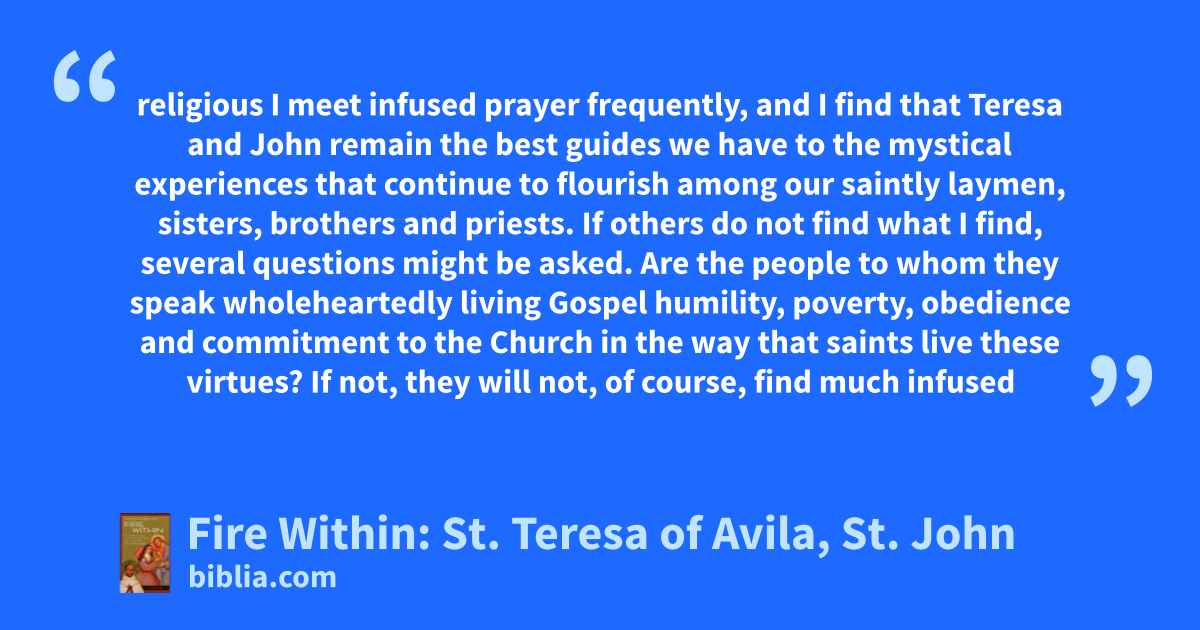 religious I meet infused prayer frequently, and I find that Teresa and John remain the best guides we have to the mystical experiences that continue to flourish among our saintly laymen, sisters, brothers and priests. If others do not find what I find, several questions might be asked. Are the people to whom they speak wholeheartedly living Gospel humility, poverty, obedience and commitment to the Church in the way that saints live these virtues? If not, they will not, of course, find much infused