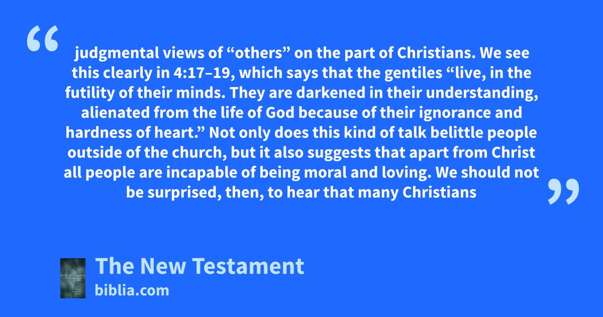 judgmental views of “others” on the part of Christians. We see this clearly in 4:17–19, which says that the gentiles “live, in the futility of their minds. They are darkened in their understanding, alienated from the life of God because of their ignorance and hardness of heart.” Not only does this kind of talk belittle people outside of the church, but it also suggests that apart from Christ all people are incapable of being moral and loving. We should not be surprised, then, to hear that many Christians