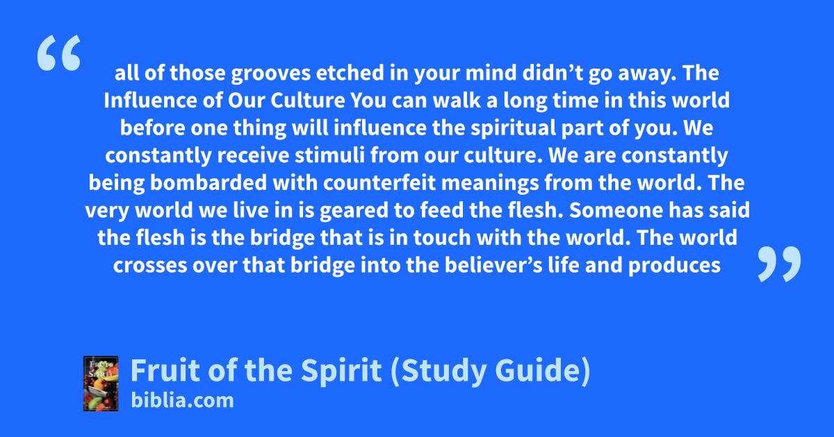 all of those grooves etched in your mind didn’t go away. The Influence of Our Culture You can walk a long time in this world before one thing will influence the spiritual part of you. We constantly receive stimuli from our culture. We are constantly being bombarded with counterfeit meanings from the world. The very world we live in is geared to feed the flesh. Someone has said the flesh is the bridge that is in touch with the world. The world crosses over that bridge into the believer’s life and produces