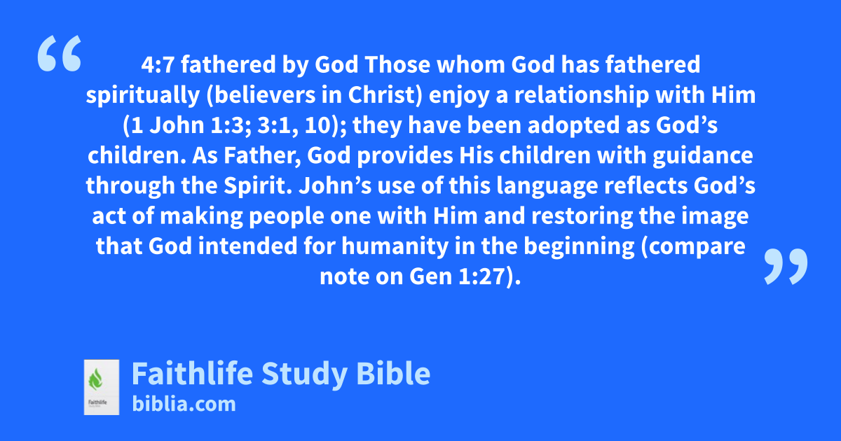 4:7 fathered by God Those whom God has fathered spiritually (believers in Christ) enjoy a relationship with Him (1 John 1:3; 3:1, 10); they have been adopted