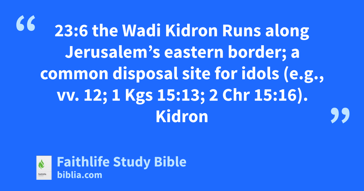23:6 the Wadi Kidron Runs along Jerusalem’s eastern border; a common disposal site for idols (e.g., vv. 12; 1 Kgs 15:13; 2 Chr 15:16).