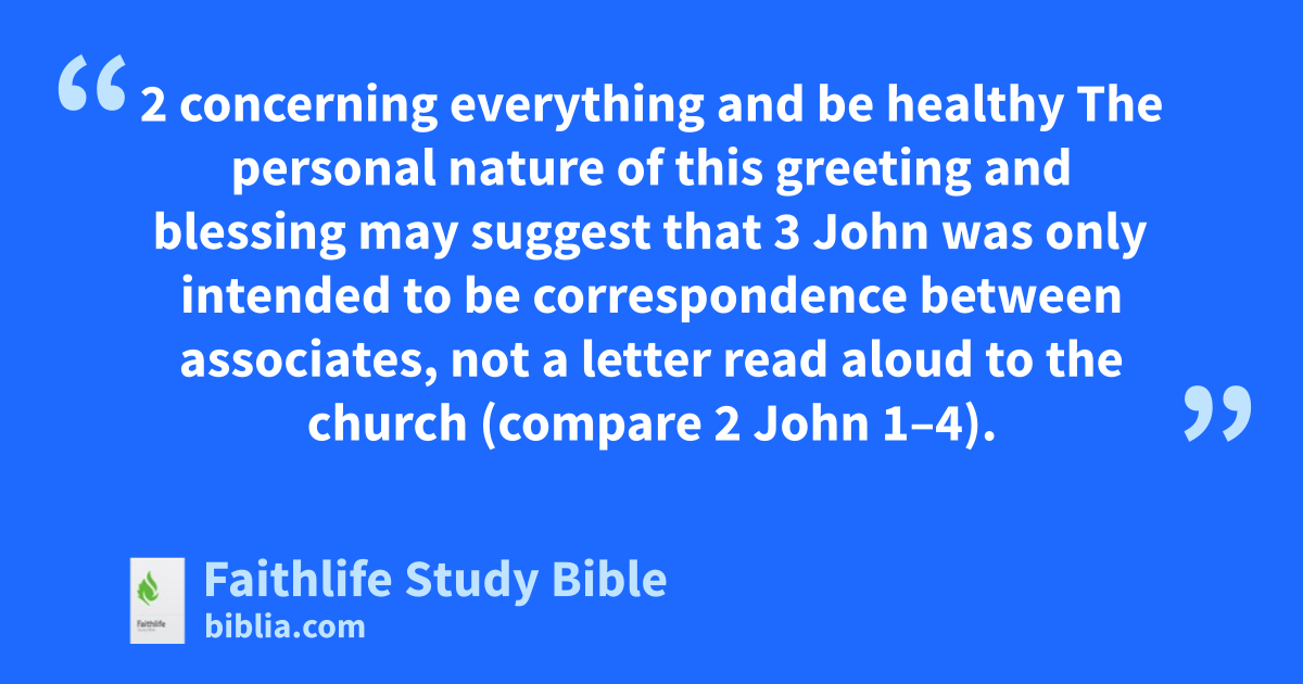 2 concerning everything and be healthy The personal nature of this greeting and blessing may suggest that 3 John was only intended to be correspondence between associates, not a letter read aloud to the church (compare 2 John 1–4).