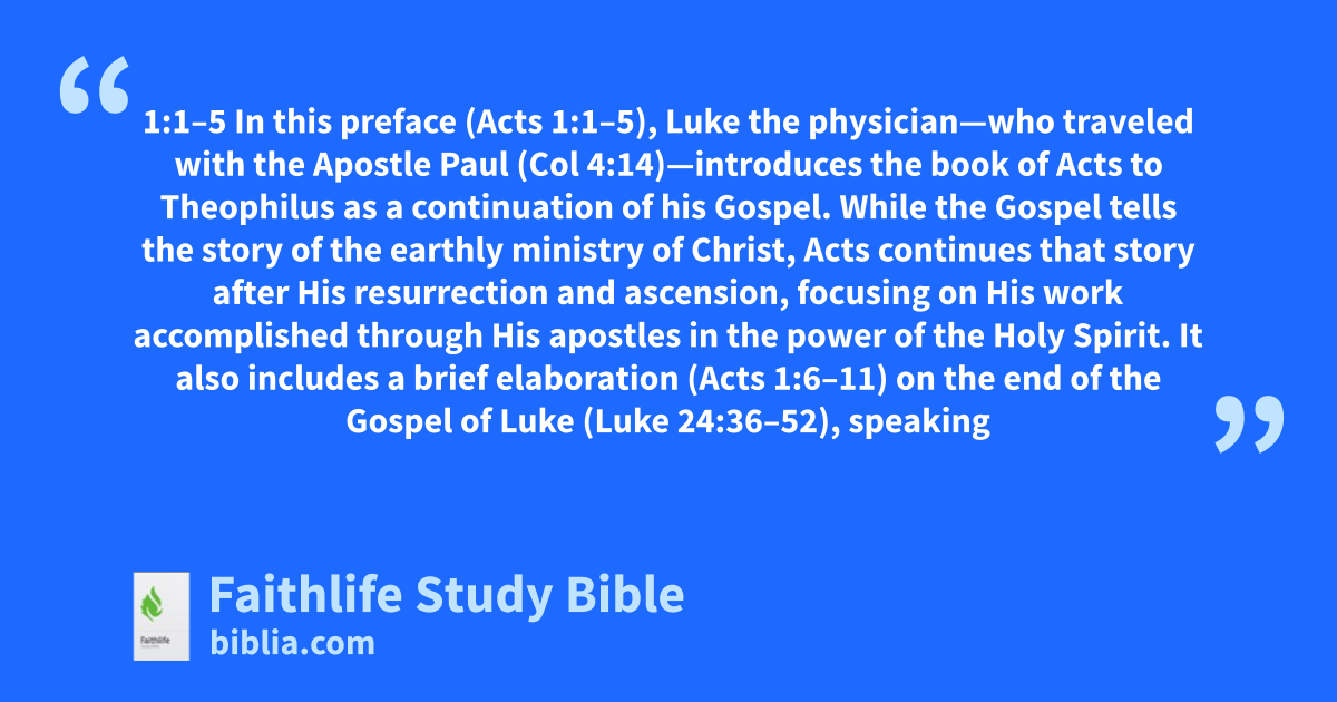 1:1–5 In this preface (Acts 1:1–5), Luke the physician—who traveled with the Apostle Paul (Col 4:14)—introduces the book of Acts At several points in Acts, Luke speaks of his firsthand involvement in the events involving the Apostle Paul (Acts 16:10–17; 20:5–15; 21:1–18; 27:1–28:16). Acts ends with Paul’s Roman imprisonment (28:16–31), which took place in the early to mid-60s ad. Luke could have written Acts shortly after Paul arrived in Rome or later in the first-century ad—depending on whether Paul’s arrival in Rome was merely the last event Luke knew of, or if it was a natural stopping point because it demonstrated that the gospel was spreading across the earth, as Jesus had commissioned (v. 8). |