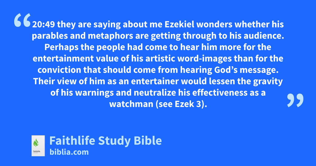 20:49 they are saying about me Ezekiel wonders whether his parables and metaphors are getting through to his audience. Perhaps the people had come to hear him more for the entertainment value of his artistic word-images than for the conviction that should come from hearing God’s message. Their view of him as an entertainer would lessen the gravity of his warnings and neutralize his effectiveness as a watchman (see Ezek 3).