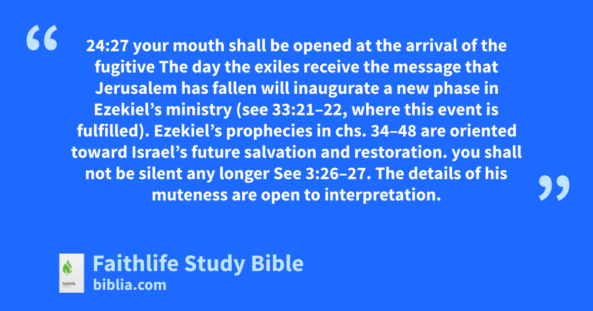 24:27 your mouth shall be opened at the arrival of the fugitive The day the exiles receive the message that Jerusalem has fallen will inaugurate a new phase in Ezekiel’s ministry (see 33:21–22, where this event is fulfilled). Ezekiel’s prophecies in chs. 34–48 are oriented toward Israel’s future salvation and restoration.