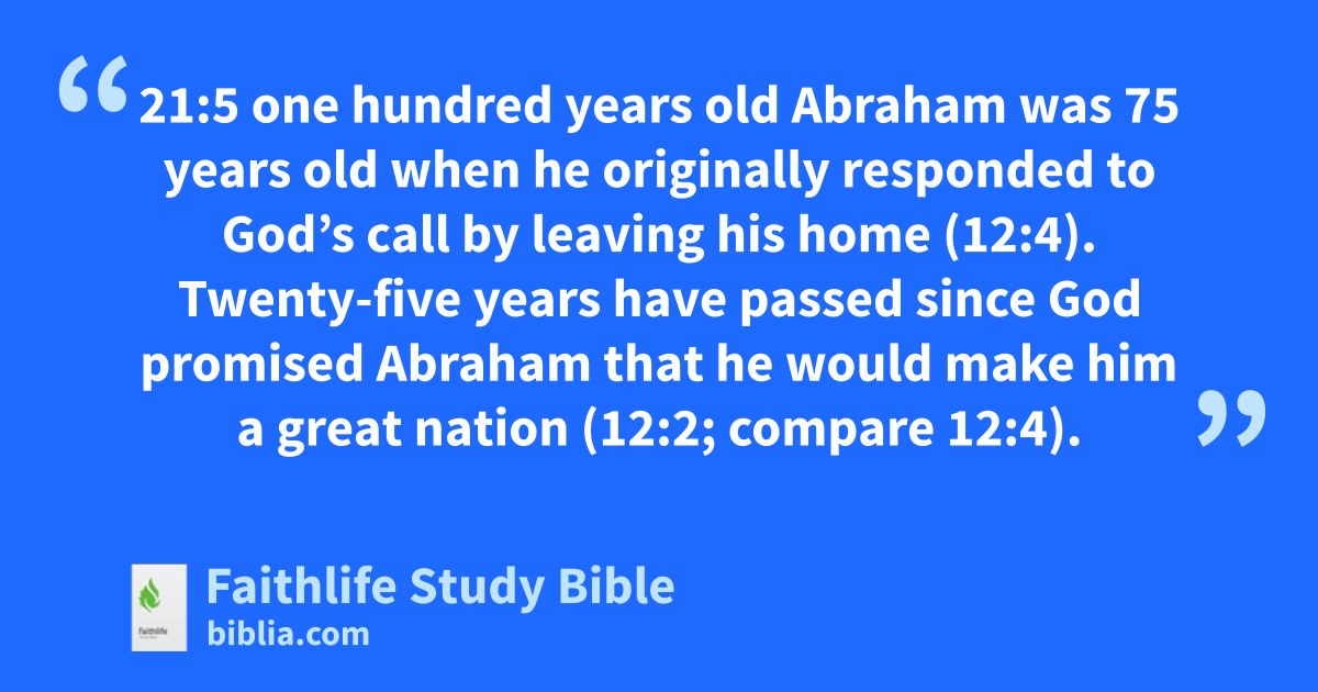 21:5 one hundred years old Abraham was 75 years old when he originally responded to God’s call by leaving his home (12:4). Twenty-five years have passed since God promised Abraham that he would make him a great nation (12:2; compare 12:4).