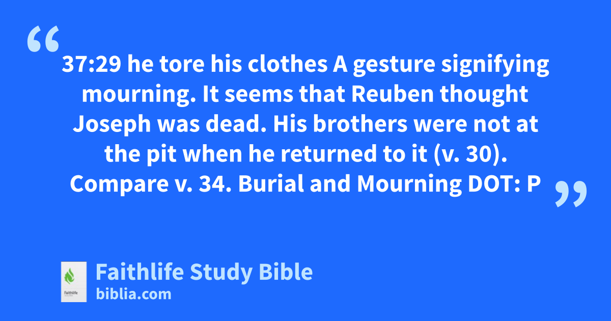 37:29 he tore his clothes A gesture signifying mourning. It seems that Reuben thought Joseph was dead. His brothers were not at the pit when he returned to it (v. 30). Compare v. 34.