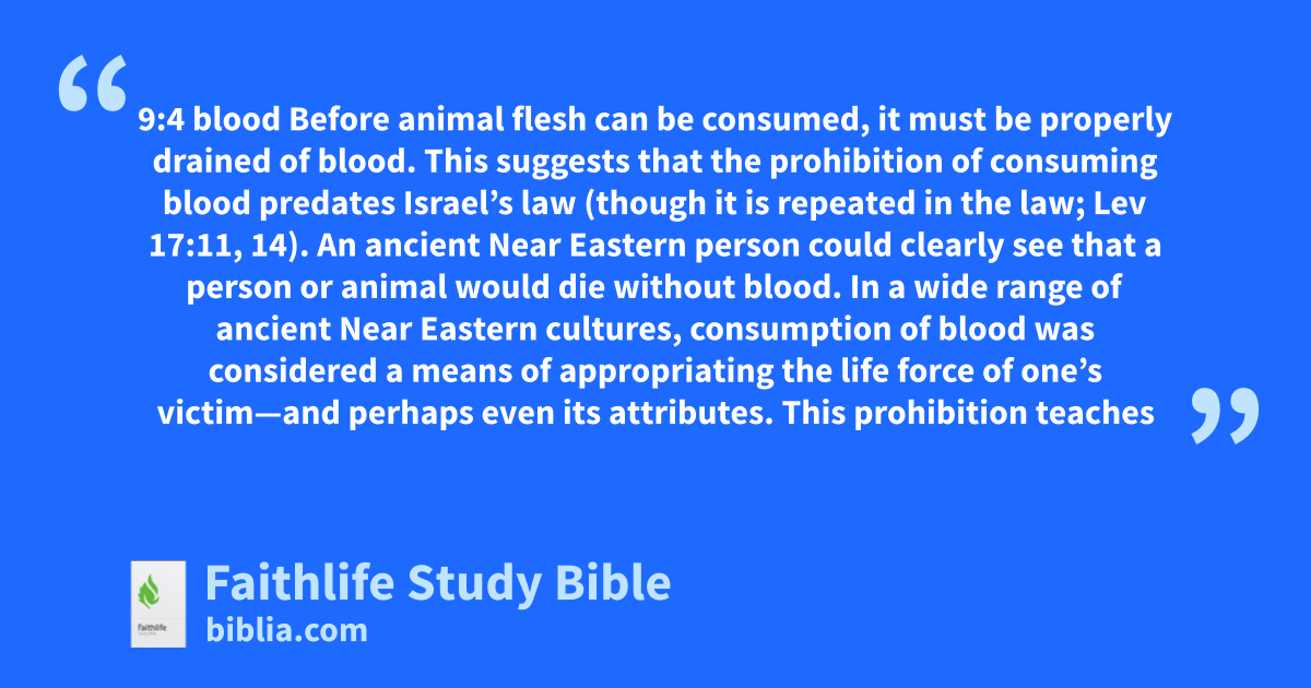 9:4 blood Before animal flesh can be consumed, it must be properly drained of blood. This suggests that the prohibition of consuming blood predates Israel’s law (though it is repeated in the law; Lev 17:11, 14).
