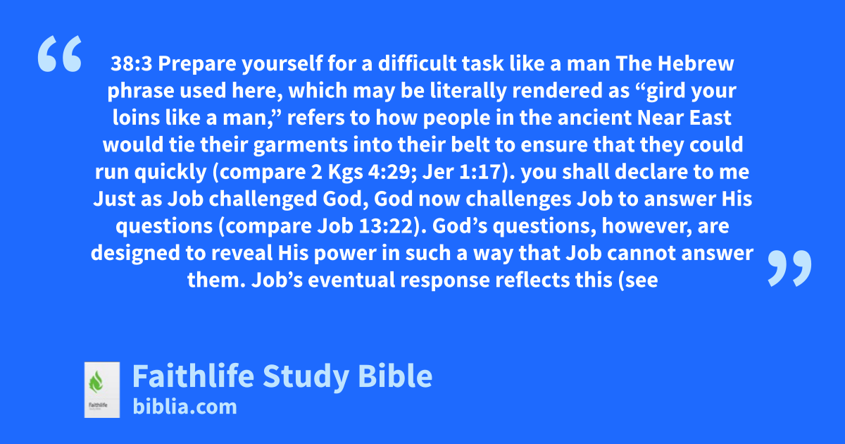 38:3 Prepare yourself for a difficult task like a man The Hebrew phrase used here, which may be literally rendered as “gird your loins like a man,” refers to how people in the ancient Near East would tie their garments into their belt to ensure that they could run quickly (compare 2 Kgs 4:29; Jer 1:17).