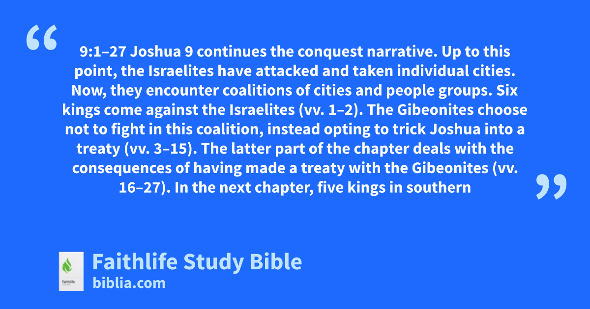 9:1–27 Joshua 9 continues the conquest narrative. Up to this point, the Israelites have attacked and taken individual cities. Now, they encounter coalitions of cities and people groups. Six kings come against the Israelites (vv. 1–2). The Gibeonites choose not to fight in this coalition, instead opting to trick Joshua into a treaty (vv. 3–15). The latter part of the chapter deals with the consequences of having made a treaty with the Gibeonites (vv. 16–27). In the next chapter, five kings in southern Canaan band together against Israel and the Gibeonites (10:1–5). In ch. 11, yet another coalition fights against Israel. These coordinated efforts do not reflect a region paralyzed in fear of Israel as noted in 2:9–11. The structure and elements of the treaty are similar to an ancient Near Eastern suzerain-vassal treaty. Though enacted by deception, the treaty was binding upon Israel, forcing Joshua to come to Gibeon’s aid in ch. 10. During the period of the monarchy, the Israelites—including David—were still honoring this treaty (see 2 Sam 21:1–8).