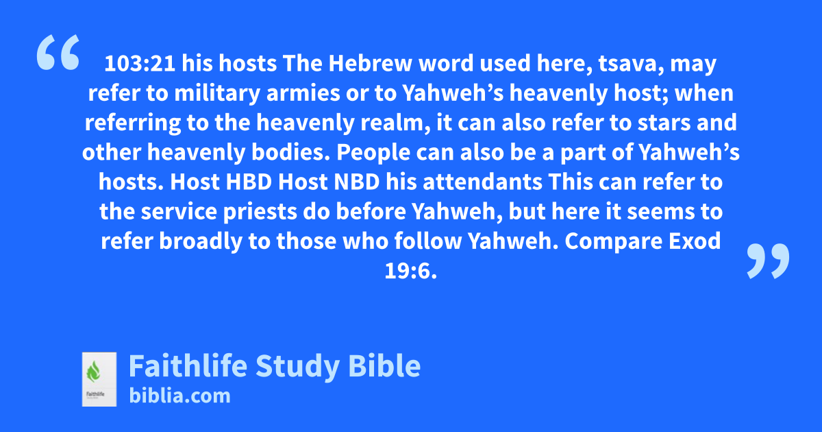 103:21 his hosts The Hebrew word used here, tsava, may refer to military armies or to Yahweh’s heavenly host; when referring to the heavenly realm, it can also refer to stars and other heavenly bodies. People can also be a part of Yahweh’s hosts.