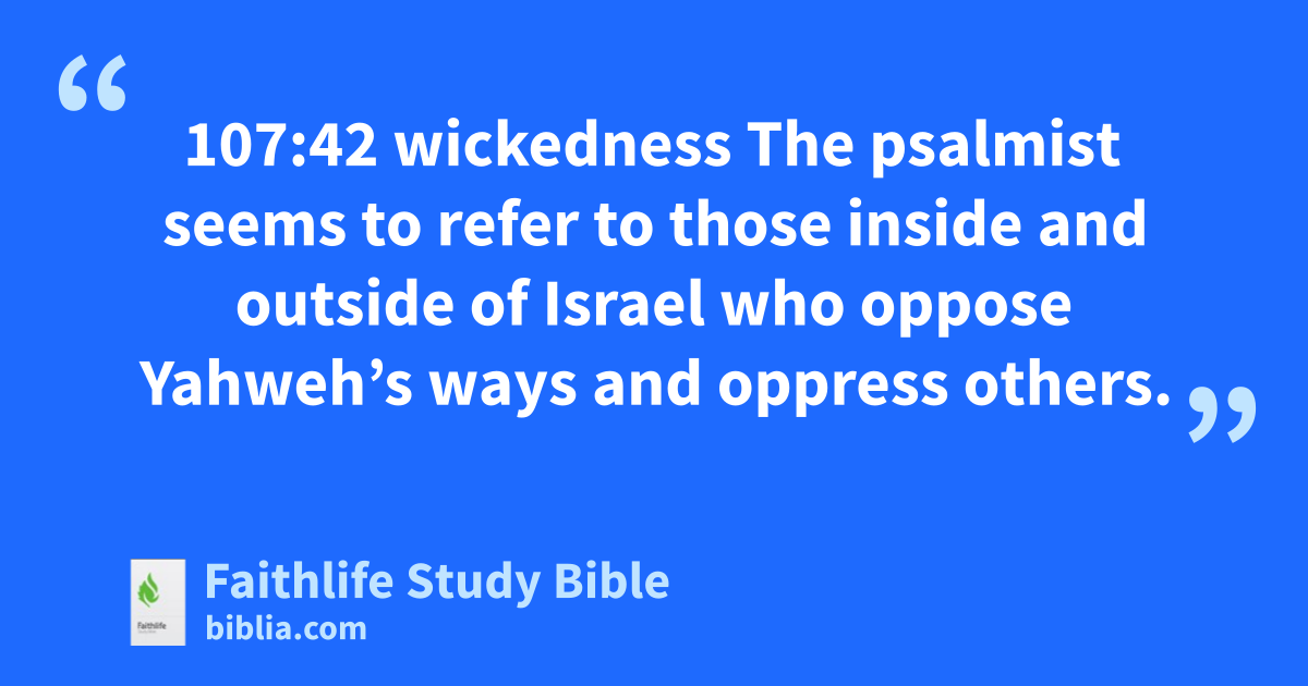 107:42 wickedness The psalmist seems to refer to those inside and outside of Israel who oppose Yahweh’s ways and oppress others.