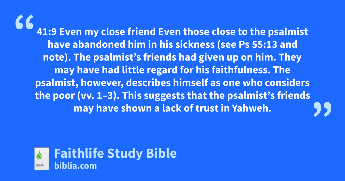 41:9 Even my close friend Even those close to the psalmist have abandoned him in his sickness (see Ps 55:13 and note).