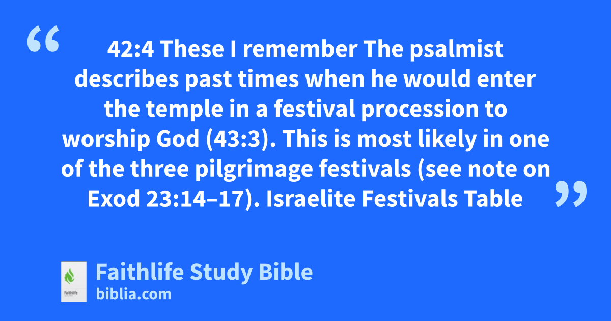 42:4 These I remember The psalmist describes past times when he would enter the temple in a festival procession to worship God (43:3). This is most likely in one of the three pilgrimage festivals (see note on Exod 23:14–17).