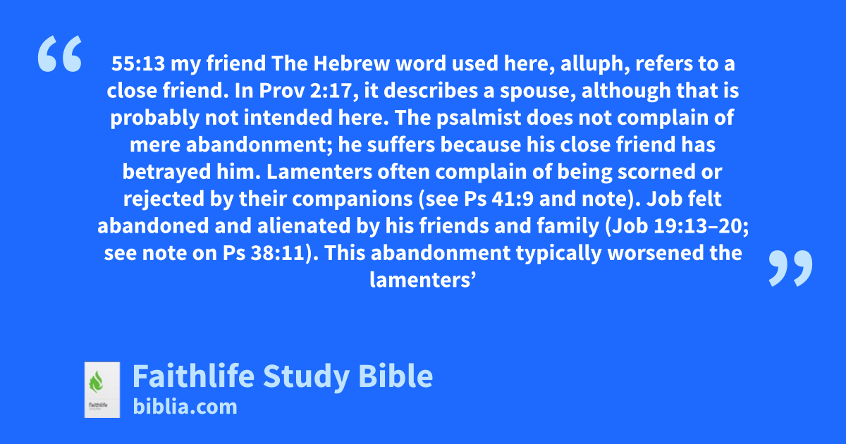 The psalmist does not complain of mere abandonment; he suffers because his close friend has betrayed him. Lamenters often complain of being scorned or rejected by their companions (see Ps 41:9 and note). Job felt abandoned and alienated by his friends and family (Job 19:13–20; see note on Ps 38:11). This abandonment typically worsened the lamenters’ suffering.