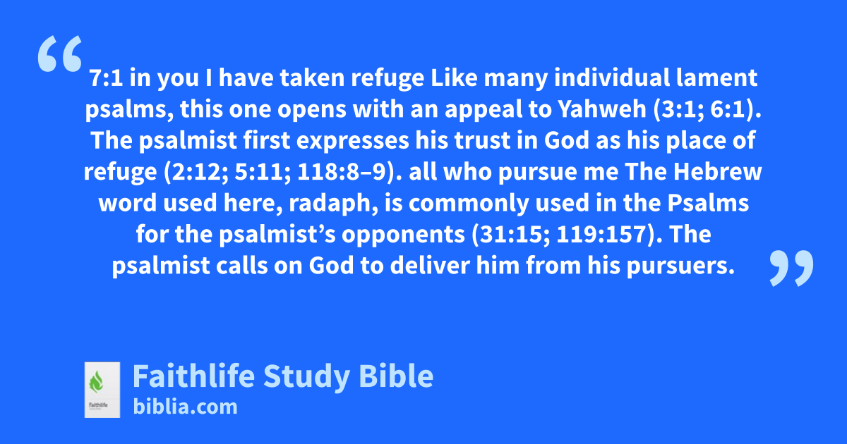 7:1 in you I have taken refuge Like many individual lament psalms, this one opens with an appeal to Yahweh (3:1; 6:1). The psalmist first expresses his trust in God as his place of refuge (2:12; 5:11; 118:8–9).