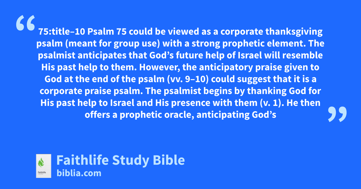 75:title–10 Psalm 75 could be viewed as a corporate thanksgiving psalm (meant for group use) with a strong prophetic element. The psalmist anticipates that God’s future help of Israel will resemble His past help to them. However, the anticipatory praise given to God at the end of the psalm (vv. 9–10) could suggest that it is a corporate praise psalm. The psalmist begins by thanking God for His past help to Israel and His presence with them (v. 1). He then offers a prophetic oracle, anticipating God’s help for Israel (vv. 2–5). After describing God’s judgment (vv. 6–8), the psalmist closes with a declaration of praise (vv. 9–10). |