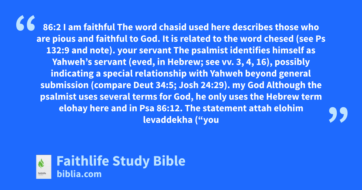 86:2 I am faithful The word chasid used here describes those who are pious and faithful to God. It is related to the word chesed (see Ps 132:9 and note).