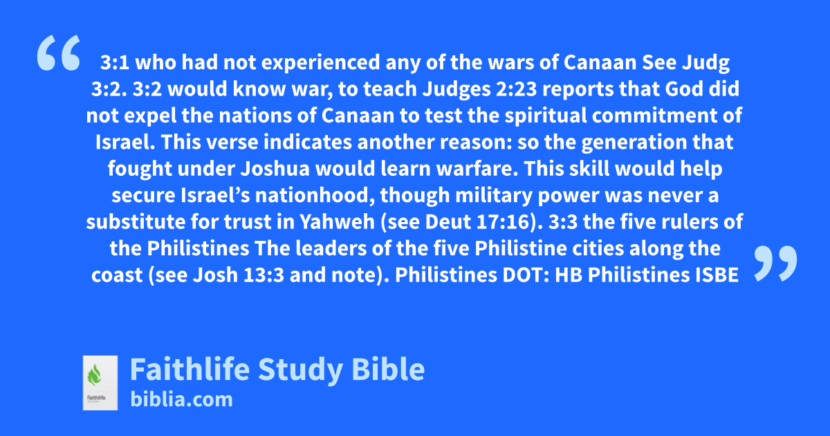 3:2 would know war, to teach Judges 2:23 reports that God did not expel the nations of Canaan to test the spiritual commitment of Israel. This verse indicates another reason: so the generation that fought under Joshua would learn warfare. This skill would help secure Israel’s nationhood, though military power was never a substitute for trust in Yahweh (see Deut 17:16).