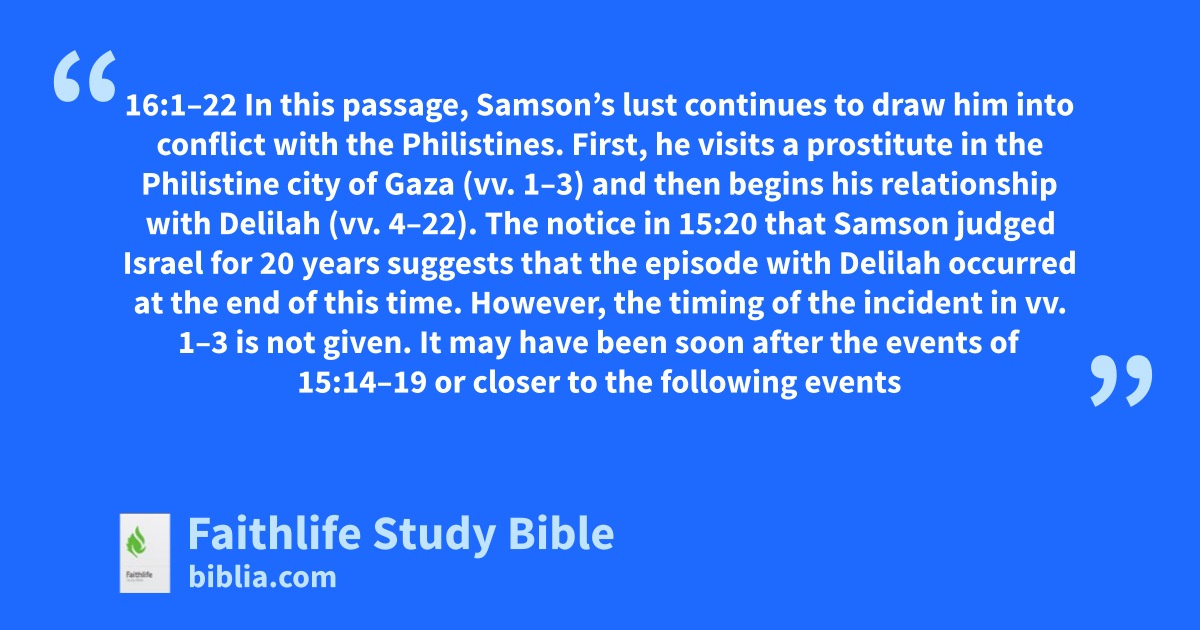 16:1–22 In this passage, Samson’s lust continues to draw him into conflict with the Philistines. First, he visits a prostitute in the Philistine city of Gaza (vv. 1–3) and then begins his relationship with Delilah (vv. 4–22). The notice in 15:20 that Samson judged Israel for 20 years suggests that the episode with Delilah occurred at the end of this time. However, the timing of the incident in vv. 1–3 is not given. It may have been soon after the events of 15:14–19 or closer to the following events with Delilah in vv. 4–22. |